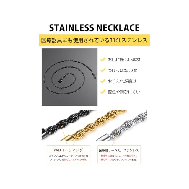 商品名:《新品未開封》[ChainsHouse] ネックレス レディース チェーンのみ ステンレス メンズ フレンチロープチェーン 黒 ブラック 65センチ 1.5ミリ アクセサリー