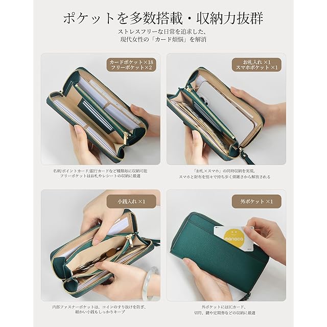 **十分な収納スペース** この長財布レディースは、最大18枚のカード、30枚のコイン、20枚のお札を収納可能です。複数のスロットとポケットが含まれており、スペースを確保しつつも大容量な選択肢となっています。