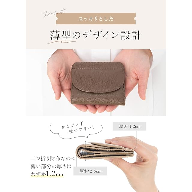 【 薄型で持ち歩きが快適な二つ折り財布 】 手のひらサイズのコンパクト財布で、ポケットやバッグにスッと収まる薄型設計。約73gの軽量デザインで、日常使いやちょっとしたお出かけにもぴったり。必要なカードやお札を効率的に収納できるシンプルな構造で、持ち物をコンパクトにまとめたいミニマリストに最適です。