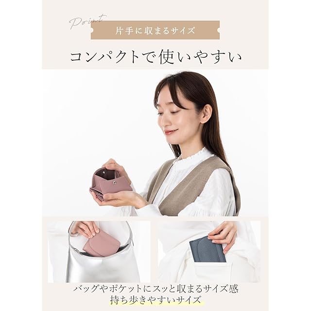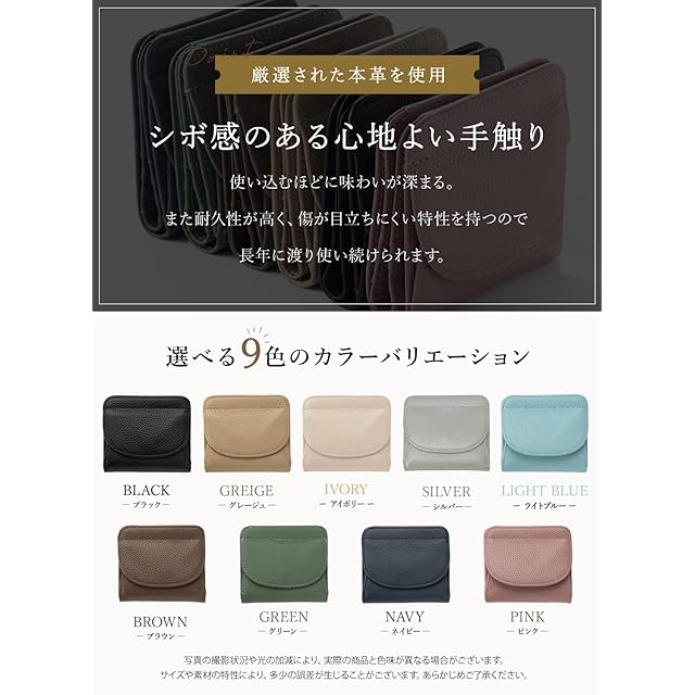 【 サイズ&カラー 】 10.4cmx9.2cmx2.6cm 横幅×高さ×幅(マチ) / 重量:約75g。ブラック、グレージュ、ブラウン、グリーン、ネイビー、ピンクの6色展開。本革の質感を引き立てるカラーを揃え、お気に入りの色で日常を彩りましょう。多彩なカラーは、ビジネスにも普段使いにも取り入れやすく、自分らしさを演出できます。