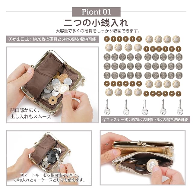 【2種類のコインポケットで使い分け自由】この財布には、2つの異なるコインポケットが備わっており、片側はクラシックながま口デザイン、もう片側はジッパー式。これにより、硬貨やカード、小型の口紅、リップクリームなど、ちょっとした必需品をしっかり収納できます。特に、極Minimalなスタイルで出かけたい方にもぴったりです。がま口部分は高品質の金属素材を使用し、複数回の電気メッキ加工が施されているため、長く使用しても輝きを失わず、錆びにくいのが魅力です。コンパクトながらも収納力が抜群で、日常使いに最適です。