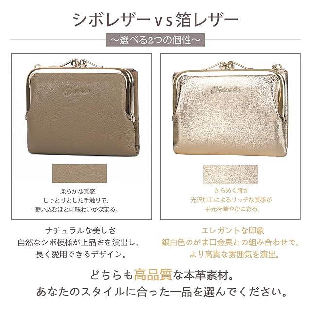 この二つ折り財布は、上質な本革を使用し、素材やデザインにこだわり抜いた逸品です。2種類の本革、シボレザーと箔レザーを採用。それぞれの素材が持つ特性により、異なる魅力を演出します。シボレザーは柔らかな手触りと自然な風合いが特徴で、使い込むほどに味わいが深まります。一方、箔レザーは光沢のある美しい加工が施されており、持つだけで高級感を引き立てます。特に箔レザーは、銀白色のがま口金具との組み合わせにより、華やかでエレガントな印象を与えます。コインポケットには2種類のデザインを採用。クラシックながま口は、硬貨の出し入れがスムーズで、しっかりとした閉まり具合が安心感を与えます。ジッパーポケットは、硬貨だけでなくリップクリームや鍵などの小物を収納するのに便利で、シーンに応じた使い分けが可能です。また、紙幣収納部分は二重構造になっており、千円札と一万円札を分けて収納できるので、財布の中をスッキリ整理整頓できます。ビジネスシーンでもスマートに対応できる機能性が魅力です。サイズは約12.7cm × 10cm × 2.5cm、重量約120gとコンパクトながらも抜群の収納力を誇ります。バッグやポケットにスッと収まり、持ち運びも楽々。箔レザーは4色展開で、それぞれ光沢のある美しい仕上がり。シボレザーはさらに豊富なカラーバリエーションをご用意しており、カジュアルからフォーマルまで、どのようなコーディネートにも合わせやすいデザインです。上質な素材と優れた機能性を兼ね備えたこの二つ折り財布は、日常使いはもちろん、特別な日のギフトとしてもおすすめです。性別や年代を問わず多くの方に愛されるデザインと実用性をぜひお楽しみください。