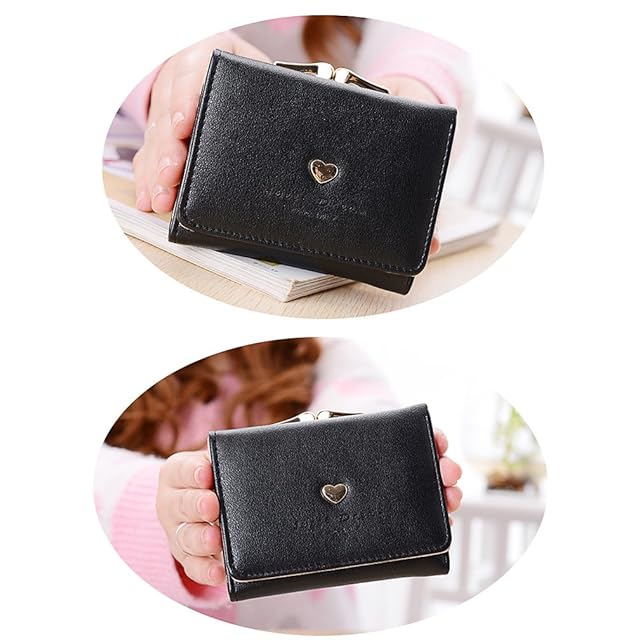 《新品未開封》[Kingsie] レディースミニ財布 がま口 三つ折り短財布 ウォレット コンパクト 可愛い ハート カードいれ 小銭入れ プレゼント (ブラック)