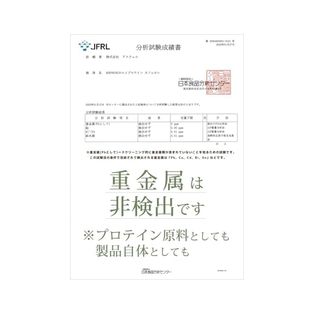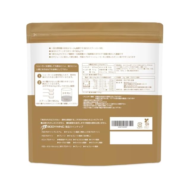 溶けやすいプロテインです。 アミノ酸スコア100、乳牛への成長ホルモン剤不使用の高品質なWPCホエイプロテインを原料に使用。 甘味料は自然植物由来のステビアを使用。甘さは控えめです。ノンカフェインです。 7種類のビタミン配合ですので、一食置き換えダイエットにも最適です。 砂糖、着色料、保存料を添加していません。※着色しておりませんので商品はカフェオレの色はしておりません。 カフェオレ風味のWPCホエイプロテインです。ステビアで甘みを加えています。※甘みが必要ない方はホエイナチュラルをお試しください。 7種類のビタミン配合。1食分24gでビタミン一日量の1/3程度補えます。 ダイエットされている方、トレーニングで筋肉量アップを考えている方に最適です。 - ・1回の摂取量の目安は16~24g程度です(添付のスプーン2~3杯)。 ・添付のスプーンすりきり1杯で約8gです。 ・水やジュースに溶かして飲む場合、市販のプロテインシェーカーをご使用いただくと溶けやすくなります。 - ■栄養成分表示(100gあたり) エネルギー 407kcal たんばく質 75.1g(無水換算78.9g) 脂質 6.9g 炭水化物 6.2g ナトリウム 170mg(食塩相当量0.43g) カルシウム 360mg - ■製品24g(1食分)あたりの栄養成分表示 ・エネルギー 98kcal ・たんばく質 18.0g(無水換算18.9g) ・脂質 1.7g ・炭水化物 1.5g ・ナトリウム 41mg(食塩相当量0.10g) ・カルシウム 86mg ・ビタミンC 33mg ・ビタミンB1 0.5mg ・ビタミンB2 0.57mg ・ビタミンB6 0.6mg ・ビタミンB12 2.0μg ・ナイアシン 4.3mg ・ パントテン酸 2.6mg - ■アミノ酸組成 タンパク質100g中(単位g) ・アラニン 4.6 ・リジン 9.4 ・アルギニン 2.5 ・メチオニン 2.1 ・アスパラギン酸 10.7 ・フェニルアラニン 3.2 ・シスチン 2.4 ・プロリン 5.7 ・グルタミン酸 17.2 ・セリン 4.7 ・グリシン 1.6 ・スレオニン 7.0 ・ヒスチジン 1.8 ・トリプトファン 1.8 ・イソロイシン 6.4 ・チロシン 3.0 ・ロイシン 10.4 ・バリン 5.6 - ■原材料名:ホエイたんぱく(アメリカまたはオランダまたはドイツ産) / レシチン(ひまわり由来)、香料、ビタミンC、甘味料(ステビア)、ナイアシン、パントテン酸、ビタミンB6、ビタミンB2、ビタミンB1、ビタミンB12 (一部に乳成分を含む) ■賞味期限:製造日より12ヶ月 ■アレルゲン情報:○本製品は乳成分を含んでおります。○本製品工場では大豆、バナナを含む製品を製造しております。