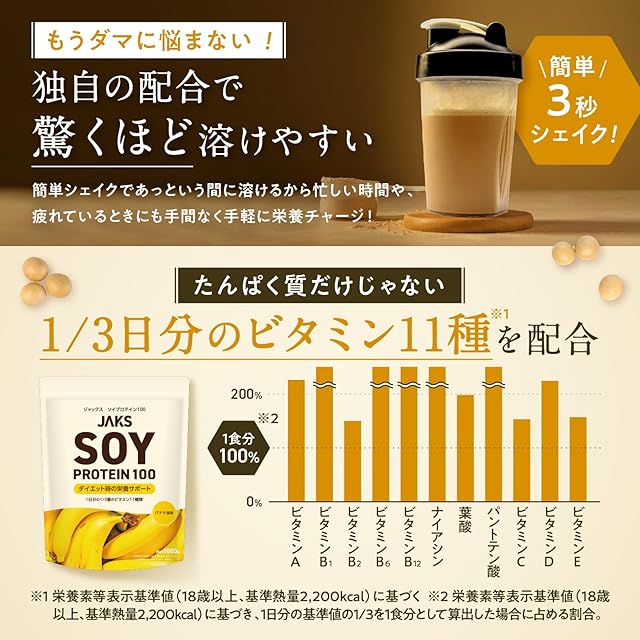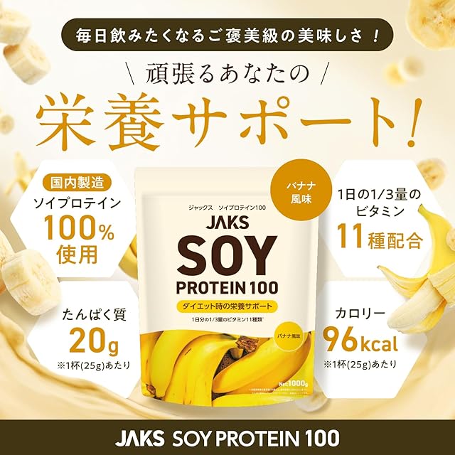 《新品未開封》JAKS ジャックス ソイ プロテイン1kg 国内製造 おいしい ダイエット ビタミン 高濃度ソイプロテイン 高たんぱく質 粉末 大豆たんぱく 溶けやすい ぷろていん (1kg, バナナ)