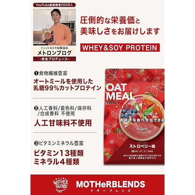 商品名:《新品未開封》マザーブレンズ ホエイ ソイ プロテイン 乳糖 99%カット 人工甘味料不使用 オートミール 粉末 食物繊維 豊富 wpc 食べる 飲める オールインワン マルチビタミン 国産 13 種配合 (900g, ストロベリー)