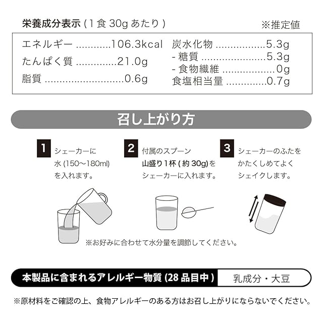 【おすすめの飲み方】シェイカーに150~180mlの冷水や牛乳と、本製品を付属スプーン山盛り1杯(約30g)を入れて、蓋を閉めた後、10秒(20回)ほどシェイクしてお召し上がりください。