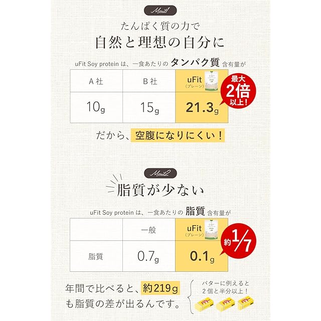 【脂質・カロリー・糖質へのこだわり】uFitソイプロテインは一杯あたりの脂質0.1g、糖質は1.2g、カロリーは91キロカロリー(プレーン味)と極限までこだわりました。また、1杯を21gにすることで、71kcalまで抑えることも可能です。カロリーが気になる方は、1杯を少なめにするのがおすすめです!