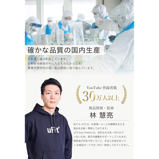 【良質なタンパク質】通常のプロテインのタンパク質含有量は、60〜70%ですが、uFitソイプロテインのたんぱく質含有量は84%以上と高水準です。必要最低限の原料を使用した、純度の高いプロテインとなっております。