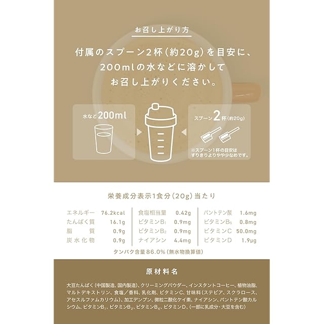 【厳選されたソイプロテイン100%使用】たんぱく原料として大豆の植物性タンパク「ソイプロテイン」100%使用。1食(製品20g)あたりタンパク質16.1g。さらに毎日に欠かせない7種類のビタミン(V.B1,V.B2,V.B6,V.C,V.D,ナイアシン,パントテン酸)を配合。