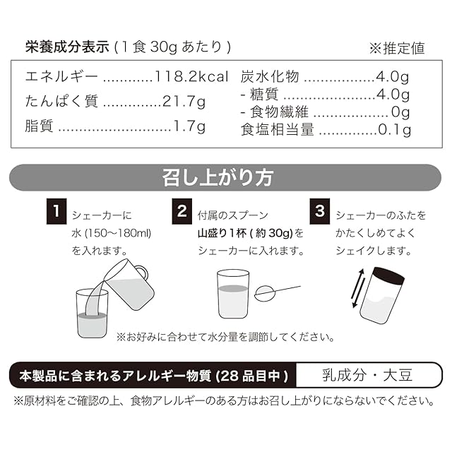 【最安値に挑戦】Verifyst(ベリフィスト)は日本中にプロテインを届けるべく、誰もが手に取りやすい価格を追求しました。物価高の今だから、毎日飲むプロテインは安く抑えたい。そんなあなたの身体と健康への想いに応えます。 【選ばれる理由】事前アンケートを基に、今求められているプロテインを作り上げました。開発のプロフェッショナルが何度も試作を重ね、無数の原料から最適な配合を導き出した結果、たんぱく質は1杯21g以上、男女問わず、水で溶かしておいしく飲めます。 【おすすめの飲み方】シェイカーに150~180mlの冷水や牛乳と、本製品を付属スプーン山盛り1杯(約30g)を入れて、蓋を閉めた後、10秒(20回)ほどシェイクしてお召し上がりください