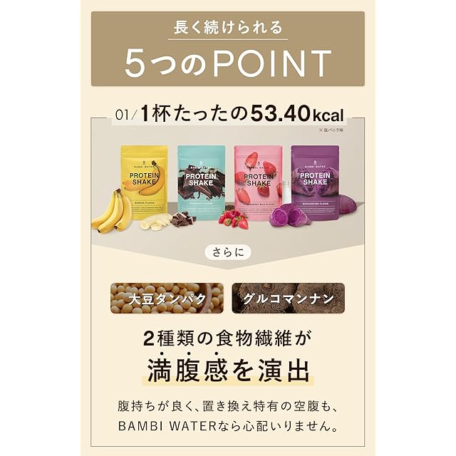 商品名:《新品未開封》バンビウォーター プロテイン 女性 【栄養機能食品11種】約17食分 人工甘味料不使用 きなこ 黒蜜きなこ ダイエット 美容プロテイン ソイ ホエイ 置き換え 250g 選べる12味 国産 低糖質 食物繊維