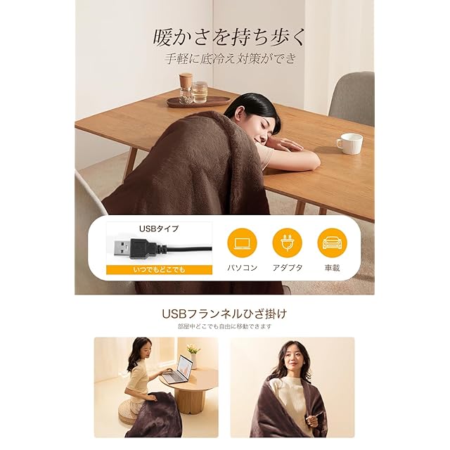 【掛け敷き兼用 USBブランケット】※電気毛布のみ、モバイルバッテリーは別売りです。USB給電式で、バッテリー(別売り)に繋ぎながら使う電気ブランケットで、100×74cmの大判サイズで、着て、羽織って、膝にかけて、腰に巻いて、足にかけて、色々使え、内蔵ヒーターによりじんわりと温め、手軽に底冷え対策可能。防寒対策として、冬の寒さを乗り切るおともにぴったりで、冷房で体が冷える夏場の室内でも活用できます。