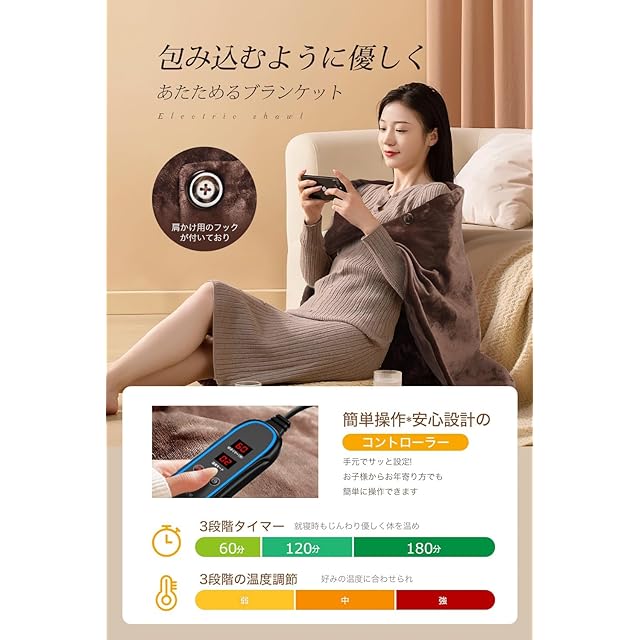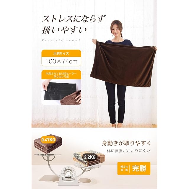 【急速発熱・しっかり保温】安定性と速暖に優れた日本製ヒーターを採用し、内部ヒーターが熱を放出して暖めると、極細繊維が温かい空気を溜め込んで、しっかり保温してくれます。厚手毛布の効果と相まって暖かさを維持しやすくなり、体がポカポカに。肩掛け用のフック付き、持ち運びにも便利で、ソファー、ベッド、オフィス、車内、テント内など色んな場所に適用、全身の寒さ対策に使えます。