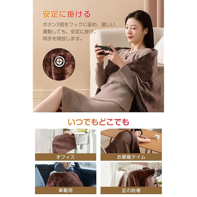 【急速発熱・しっかり保温】安定性と速暖に優れた日本製ヒーターを採用し、内部ヒーターが熱を放出して暖めると、極細繊維が温かい空気を溜め込んで、しっかり保温してくれます。厚手毛布の効果と相まって暖かさを維持しやすくなり、体がポカポカに。肩掛け用のフック付き、持ち運びにも便利で、ソファー、ベッド、オフィス、車内、テント内など色んな場所に適用、全身の寒さ対策に使えます。