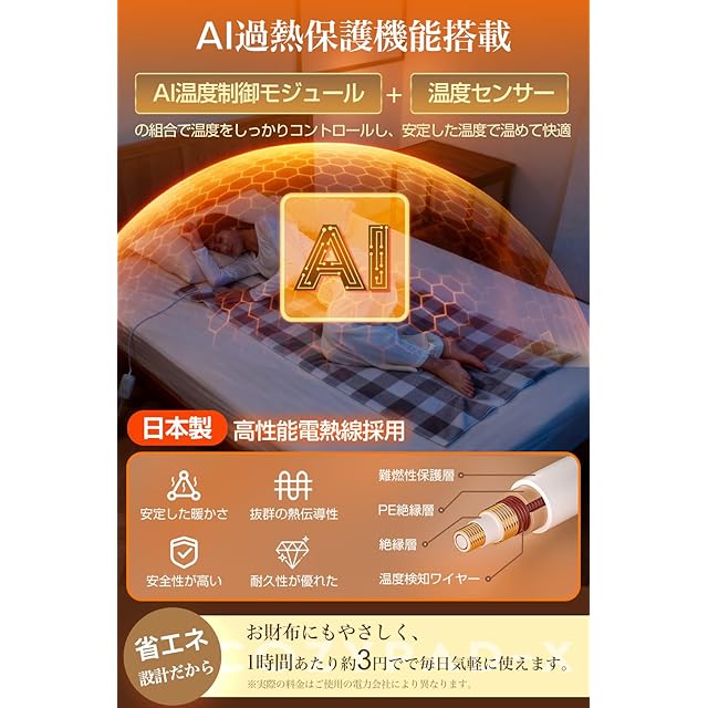 【安全性パッチリ!AI過熱保護&タイマー付き】温度センサーを内蔵し、リアルタイムで温度を検知し、AIが温度をコントロールして維持してくれます。過熱を防ぎ、安全性パッチリ!!また、この電気毛布 タイマー付き 、1-12Hの範囲で1時間単位で自由に設定できます。寝ている間に熱くなりすぎる心配もなく、快適な睡眠をとることができます。電気毛布の消し忘れや電気代の節約にも役立ちます。