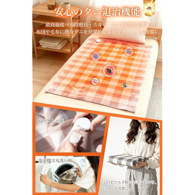 【洗える電気毛布&ダニ退治機能】コントローラーを外せば、洗濯機か手洗いで丸洗いが可能で、清潔さを保ちながら長期間愛用できます。また、高温(10段階目)で1時間以上運転し、布団の中のダニを退治、快適な日々をサポートします。