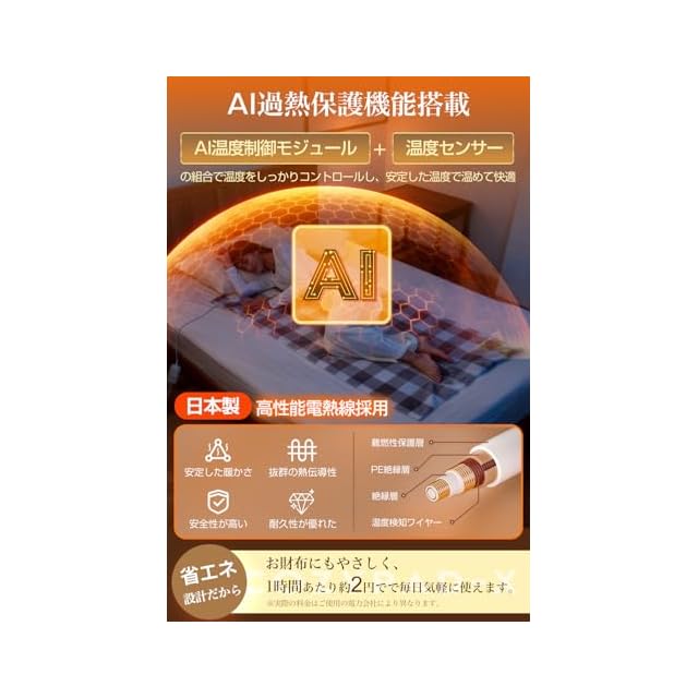 【安全性パッチリ!AI過熱保護&タイマー付き】温度センサーを内蔵し、リアルタイムで温度を検知し、AIが温度をコントロールして維持してくれます。過熱を防ぎ、安全性パッチリ!!また、この電気毛布 タイマー付き 、1-12Hの範囲で1時間単位で自由に設定できます。寝ている間に熱くなりすぎる心配もなく、快適な睡眠をとることができます。電気毛布の消し忘れや電気代の節約にも役立ちます。