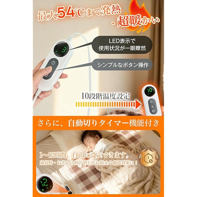 【安全性パッチリ!AI過熱保護&タイマー付き】温度センサーを内蔵し、リアルタイムで温度を検知し、AIが温度をコントロールして維持してくれます。過熱を防ぎ、安全性パッチリ!!また、この電気毛布 タイマー付き 、1-12Hの範囲で1時間単位で自由に設定できます。寝ている間に熱くなりすぎる心配もなく、快適な睡眠をとることができます。電気毛布の消し忘れや電気代の節約にも役立ちます。