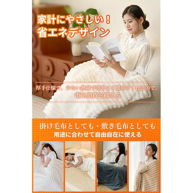 【ゆったり使えるサイズ感&省エネデザイン】2サイズ展開で、用途や好みに合わせて選べます。Mサイズ:140×80CM、Lサイズ:190x130CM。体をすっぽりと包み、ぽかぽかと体を温められます。厚手素材採用で、熱が逃せず、従来品より電力消耗が低く省エネです。消費電力:Mサイズ:70W、Lサイズ:120Wで、一時間の電気代は約 .9~3.2で超経済的です。冬のギフトとして、大切な人への新年ギフト クリスマスプレゼント などにも最適です。