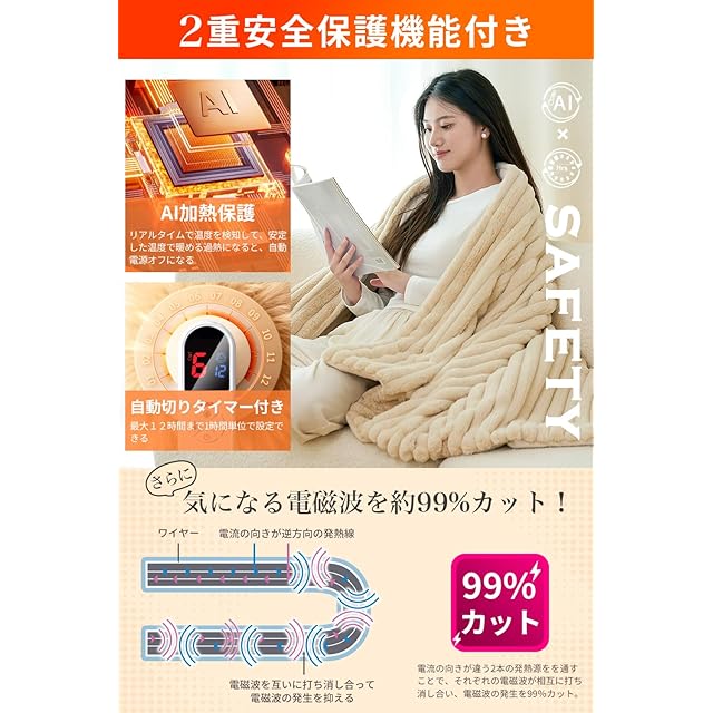 【細部までこだわり抜いた使いやすさ& 電気毛布 掛敷兼用】頭寒足熱配線設計で体全体の快適さを追求しているでんき毛布は、冷えやすい足元はしっかりと、 首元・胸元はソフトに温めることで 快適な睡眠をサポートします。そのうえ気になる電磁波の発生を90%低減させる設計を採用、長時間安心して使用できる電気ブランケットです。柔くて 電気毛布 掛け 敷き 巻き、様々な使い方ができるので、幅広いシーンで活躍します。ソファや布団に敷く電気敷き毛布として、テレワークで電気ひざ掛け 電気肩掛けとして、体を包み込む電気掛け毛布として使用できます。この冬はこのでんき毛布一枚で快適に過ごせる!