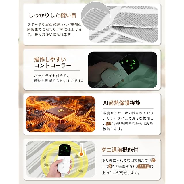 【ダニ退治機能・抗菌除臭・本体丸洗い可能】お肌の近くで使う寝具だから、肌にやさしくて清潔を保ち、健康のために高温でダニ退治機能もあり、毛布本体を折りたたんで、目盛「7」で1~2時間高温運転するだけで99.9%のダニを退治できます。さらにコントローラーを取り外し、電気毛布を洗濯ネットに入れて、自宅の洗濯機で丸洗いできますので、いつでも清潔にお使いいただけます(※乾燥機や洗濯機の乾燥機能は使用しないでください)。