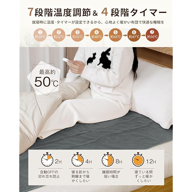 【7段階温度調整・切り忘れ防止タイマー付き】電気毛布はコントローラー付き、ボタンを押すだけの簡単操作で、温度とタイマーの時間を細かく設定することができます。30℃、35℃、39℃、43℃、48℃の7段階で温度調節が可能で、家族全員が快適に使用できます。また、2時間、4時間、8時間、12時間に設定可能なオフタイマーを備えており、就寝時などに便利です。タイマーが設定しない場合、2時間後自動に電源が切れ、付けっぱなしを防止可能。低温やけどや消し忘れによる事故を防ぎ、省エネにも貢献し、切り忘れの心配も軽減できるため、高齢者の方も安心して使用できます。