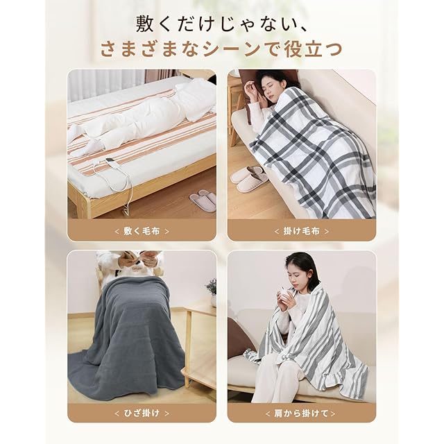 【軽くて柔かい生地・160×80cmサイズ&掛敷両用で四季対応】掛敷両用電気毛布はポーラーフリース生地を使用し、軽くてやわらかい肌ざわりなので、重い毛布が苦手な方でも快適に使用できます。また、軽いため、持ち運びにも便利で、車中泊やアウトドアなど、様々なシーンで活躍します。160x80cmの適切なサイズで、ひざ掛けはもちろん 、肩掛け、敷き毛布としても大活躍、ベッドやソファ、デスクなどのさまざまな場所でご利用いただけます。冬の寒さ対策だけでなく、春や秋の少し肌寒い時期、そして夏場の冷房による冷え対策としても一年中活用できます。