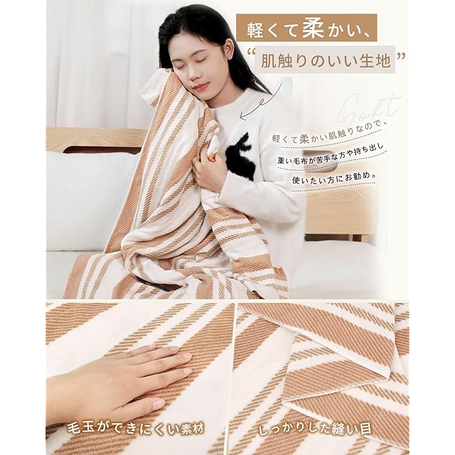 【軽くて柔かい生地・160×80cmサイズ&掛敷両用で四季対応】掛敷両用電気毛布はポーラーフリース生地を使用し、軽くてやわらかい肌ざわりなので、重い毛布が苦手な方でも快適に使用できます。また、軽いため、持ち運びにも便利で、車中泊やアウトドアなど、様々なシーンで活躍します。160x80cmの適切なサイズで、ひざ掛けはもちろん 、肩掛け、敷き毛布としても大活躍、ベッドやソファ、デスクなどのさまざまな場所でご利用いただけます。冬の寒さ対策だけでなく、春や秋の少し肌寒い時期、そして夏場の冷房による冷え対策としても一年中活用できます。