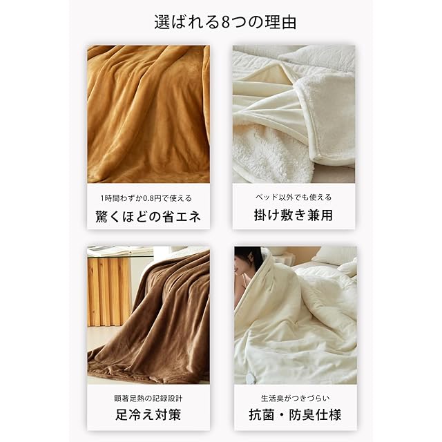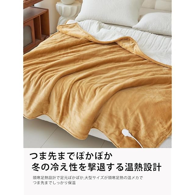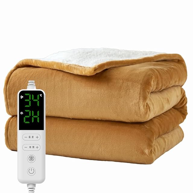 電気毛布 掛け敷き兼用。カラー:CAMEL/キャメル サイズ:シングル:(130 ×190cm) 素材構成:フランネル (極細マイクロファイバー) セット内容:・電気毛布本体x1・コントローラーx1・取扱説明書x1、機能 ・9段階温度調節機能(30-32-34-36-38-40-42-45-50℃)・1~12時間に12段階タイマー機能 ・過熱保護 ・急速加熱 最新性能を詰め込み、冬をぽかぽかに・電気毛布はほかの暖房器具と比べて電気代が圧倒的に安い点が魅力があります。① すぐに暖まる速暖機能で、寒い季節も快適に過ごせます 高性能なヒーターを内蔵し、スイッチを入れてからわずか数分で布団全体が均一に暖まります。就寝前の冷たい布団もすぐに心地よい温もりに変わるため、寒がりな方や冷え性の方に最適です。冬の朝晩に大活躍します。