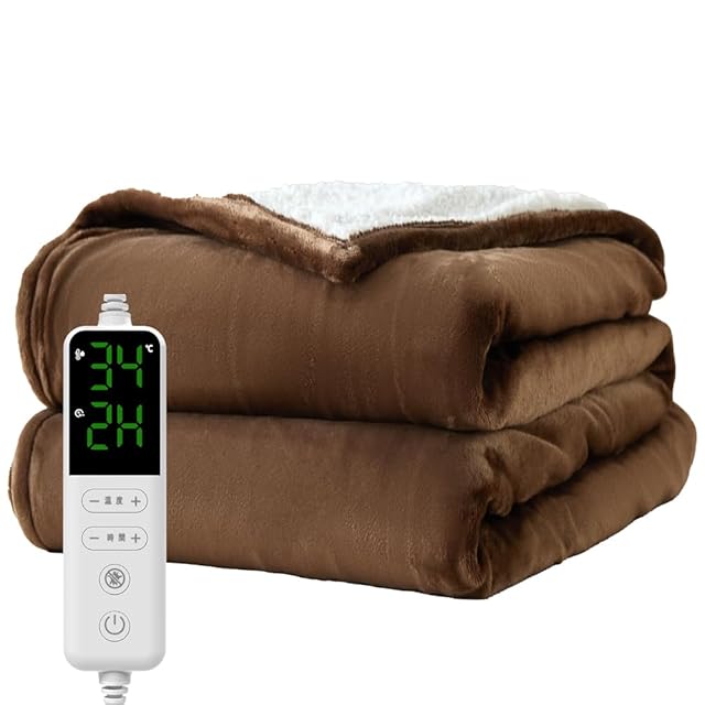 電気毛布 掛け敷き兼用。カラー:BROWN/ブラウン サイズ:ダブル (170×190cm) 素材構成:フランネル (極細マイクロファイバー) セット内容:・電気毛布本体x1・コントローラーx1・取扱説明書x1、機能 ・9段階温度調節機能(30-32-34-36-38-40-42-45-50℃)・1~12時間に12段階タイマー機能 ・過熱保護 ・急速加熱 最新性能を詰め込み、冬をぽかぽかに・電気毛布はほかの暖房器具と比べて電気代が圧倒的に安い点が魅力があります。① すぐに暖まる速暖機能で、寒い季節も快適に過ごせます 高性能なヒーターを内蔵し、スイッチを入れてからわずか数分で布団全体が均一に暖まります。就寝前の冷たい布団もすぐに心地よい温もりに変わるため、寒がりな方や冷え性の方に最適です。冬の朝晩に大活躍します。