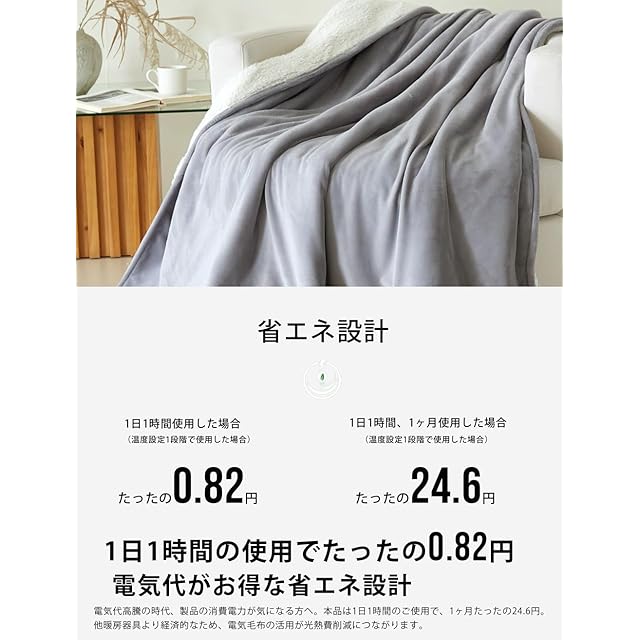 電気毛布 掛け敷き兼用。カラー:GRAY/グレー サイズ:セミダブル (150×190cm) 素材構成:フランネル (極細マイクロファイバー) セット内容:・電気毛布本体x1・コントローラーx1・取扱説明書x1、機能 ・9段階温度調節機能(30-32-34-36-38-40-42-45-50℃)・1~12時間に12段階タイマー機能 ・過熱保護 ・急速加熱 最新性能を詰め込み、冬をぽかぽかに・電気毛布はほかの暖房器具と比べて電気代が圧倒的に安い点が魅力があります。