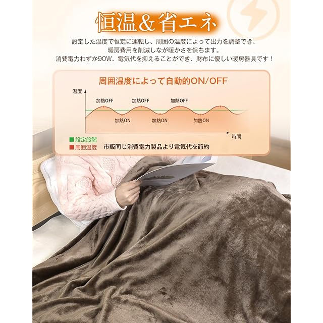 【頭寒足熱&恒温運転&省エネ】電気掛け毛布の内部は「頭寒足熱配線」設計で、布団内部が素早く温まる、足元を中心にしっかりあたためますので快適にすごせます。足先が冷えてなかなか寝つけない人にもおすすめです。また設定した温度で恒定に運転し、周囲の温度によって出力を調整でき、暖房費用を削減しながら暖かさを保ちます。更に電気敷き毛布の消費電力は僅か90Wで、ほかの暖房家電と比べて、電気代が安く、節電できる点が魅力です。財布に優しい暖房器具です!