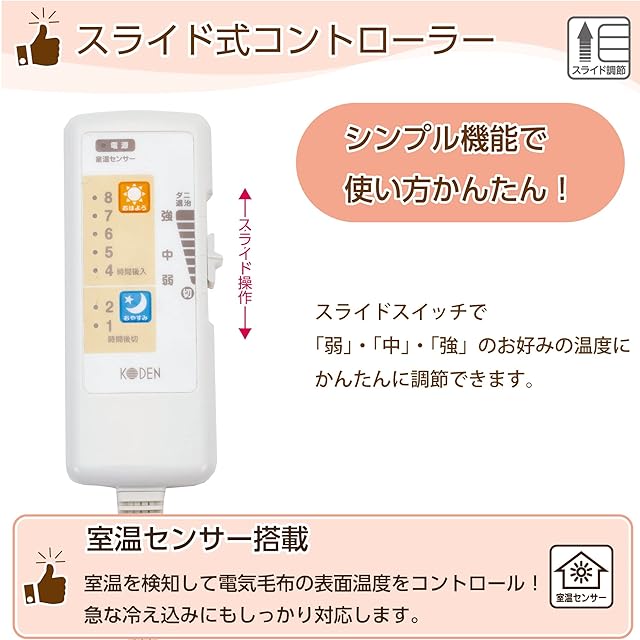 【おやすみ・おはようタイマー搭載】就寝時に電源オフを1時間と2時間で選べるおやすみタイマー、電源オンをを4~8時間後で選べるおはようタイマーが搭載されております。就寝時はあたため過ぎず快適に睡眠、起床時はあたたかく気持ちの良い目覚めができます。