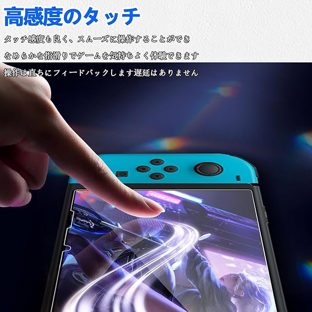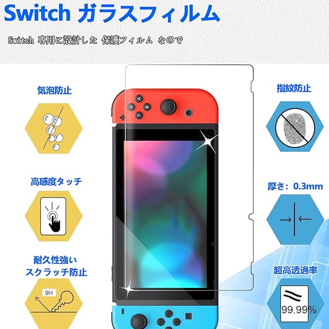 【対応機種・ブルーライトカット】Nintendo Switch 専用に設計した 保護フィルム なので、必ずご購入前にお使いの携帯電話の機種をご確認ください。ブルーライトとは、自然界にも存在する波長が短く強い光で、角膜や水晶体で吸収されずに網膜まで到達し、目や睡眠に影響を及ぼしています。本製品にはブルーライトカットコーティングが施されているので、目の負担を減少させられ、長時間眺める方に優れる効果が発揮できます。画質を損なわないで お客様の目をゲーム機から発せれる光から守ります。 【ラウンドエッジ加工・99.9%高透過率】真空メッキプロセスを使用し、正しい丸みをエッジ処理して、不快感がありません。しかもエッジ部分へ衝撃が少なく、快適で滑らかな肌触りを提供する同時に、使用中に鋭い角のエッジで指を傷されません。液晶画面の隅から隅までしっかり保護できるフルラウンド設計です。0.3mmの厚さでタッチスクリーンの感度がよく、なめらかな指滑りでゲームを今まで以上に体験しましょう。99.9%高透過率を用いる高級素材を採用しておるので元々の画面の色鮮やかさが変わらない高透明度を持ち、画質を損ねず、違和感なくゲームを楽しめます。