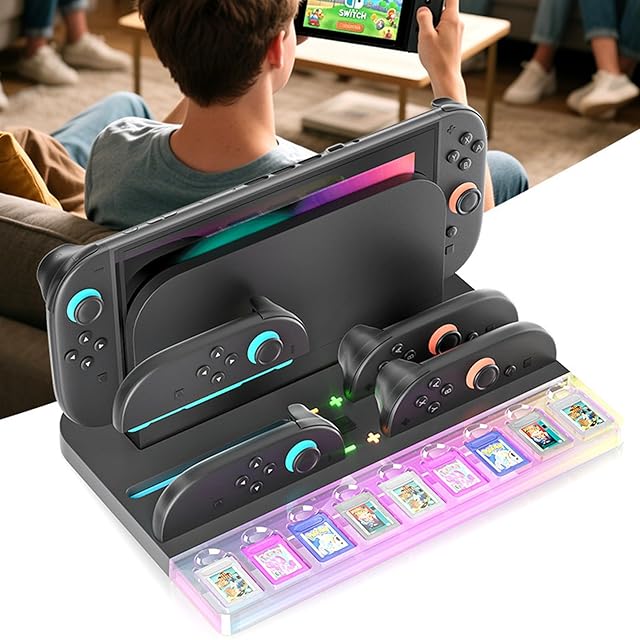 【収納に便利と安全性】同時に4つのNS 2 joy con用 コントローラを充電し、9枚のゲームカードを収納することもできます,ます、そして過度充電を自動的に充電を停止する。