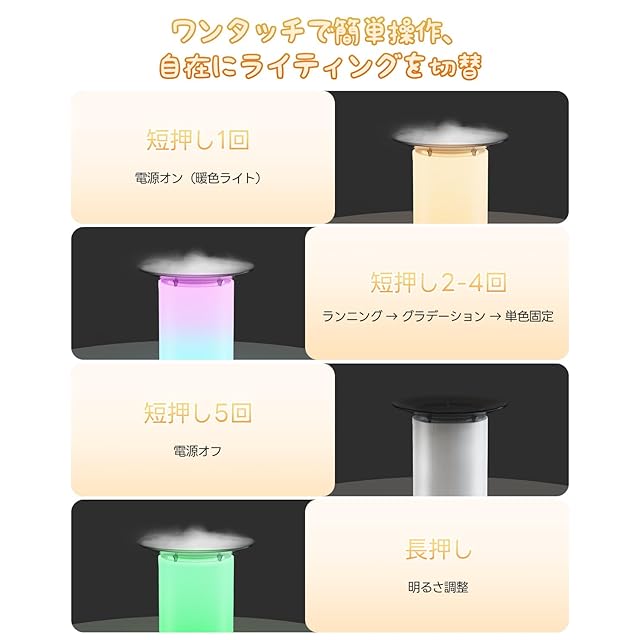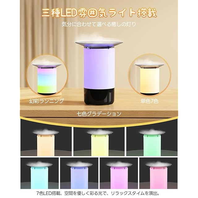 【7色LEDライト&3種類の点灯モード搭載】 本体には7色に変化するLEDライトを搭載。単色点灯・呼吸ライト・グラデーションの3つのモードから選べるため、気分やシーンに合わせて使い分け可能です。やさしい光はナイトライトとしても活躍し、寝室に癒しの雰囲気をプラスします。