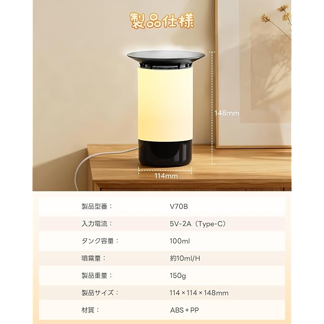 【アロマオイル対応・香りでリラックス空間を演出】 タンクにお好みのアロマオイルを数滴入れるだけで、加湿と同時に心地よい香りが広がります。リラクゼーションやストレス解消に効果的で、リビングや寝室はもちろん、ヨガやサロンなど癒しの空間づくりにも活躍します。