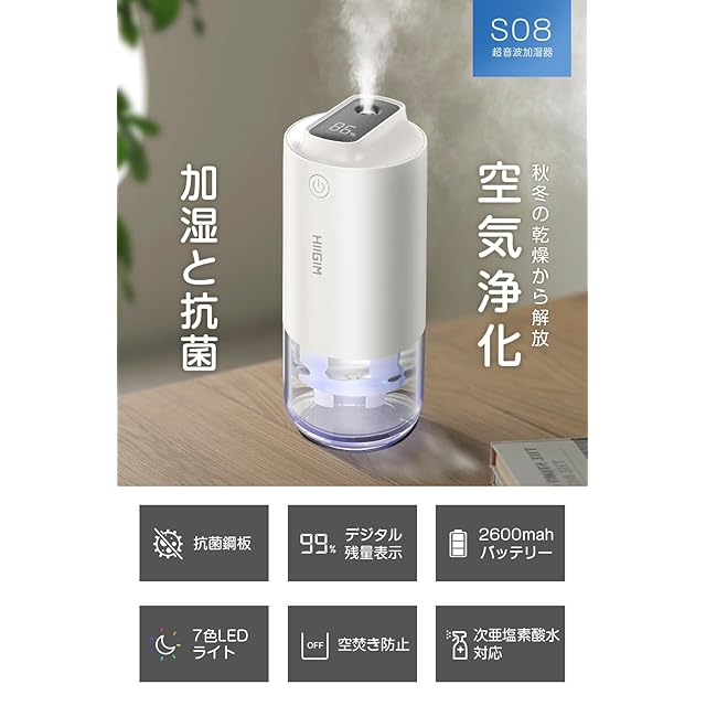 【抗菌鋼板×次亜塩素酸水対応|清潔なミストで家族を守る】S08加湿器は、抗菌鋼板を搭載し、水中の雑菌を除去してからミスト化。より清潔で安全な潤いをお届けします。さらに、50ppm以下の次亜塩素酸水対応により、加湿と同時に除菌・空間清浄も可能。お子様やペットのいる家庭にも安心です。水位センサー内蔵で水切れ時は自動停止する空焚き防止機能付き。USB充電式&コードレス仕様で、デスク・寝室・車載など場所を選ばず使用できます。超音波式 卓上加湿器として、乾燥対策・花粉症対策・ウイルス対策に最適です。