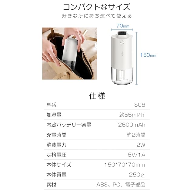 【簡単給水&お手入れラクラク|車載・デスクどちらでも快適】フタを開けてすぐに給水できる手軽さ、お手入れもラクラクです。滑り止めパッド付きで転倒しにくく、密閉構造により万が一倒れても水漏れの心配がありません。ペットボトルサイズのコンパクト設計で、デスクや車内、旅行先などどこでも活躍。卓上加湿器・車載加湿器・ポータブル加湿器として使える多用途モデル。加湿・除菌・リフレッシュをこの一台で実現します。