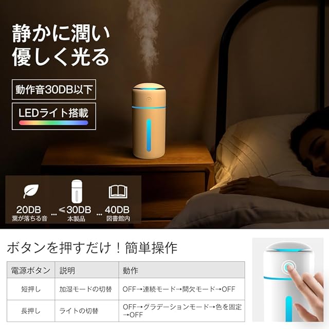小型加湿器、コードレス仕様<br> おしゃれな7色ライト<br> 簡単なワンボタン操作<br> 銀イオン(Ag+)抗菌加工済<br> 大容量バッテリー内蔵【1200mAh、3.7V、4.44Wh】<br> 静音運転<br>