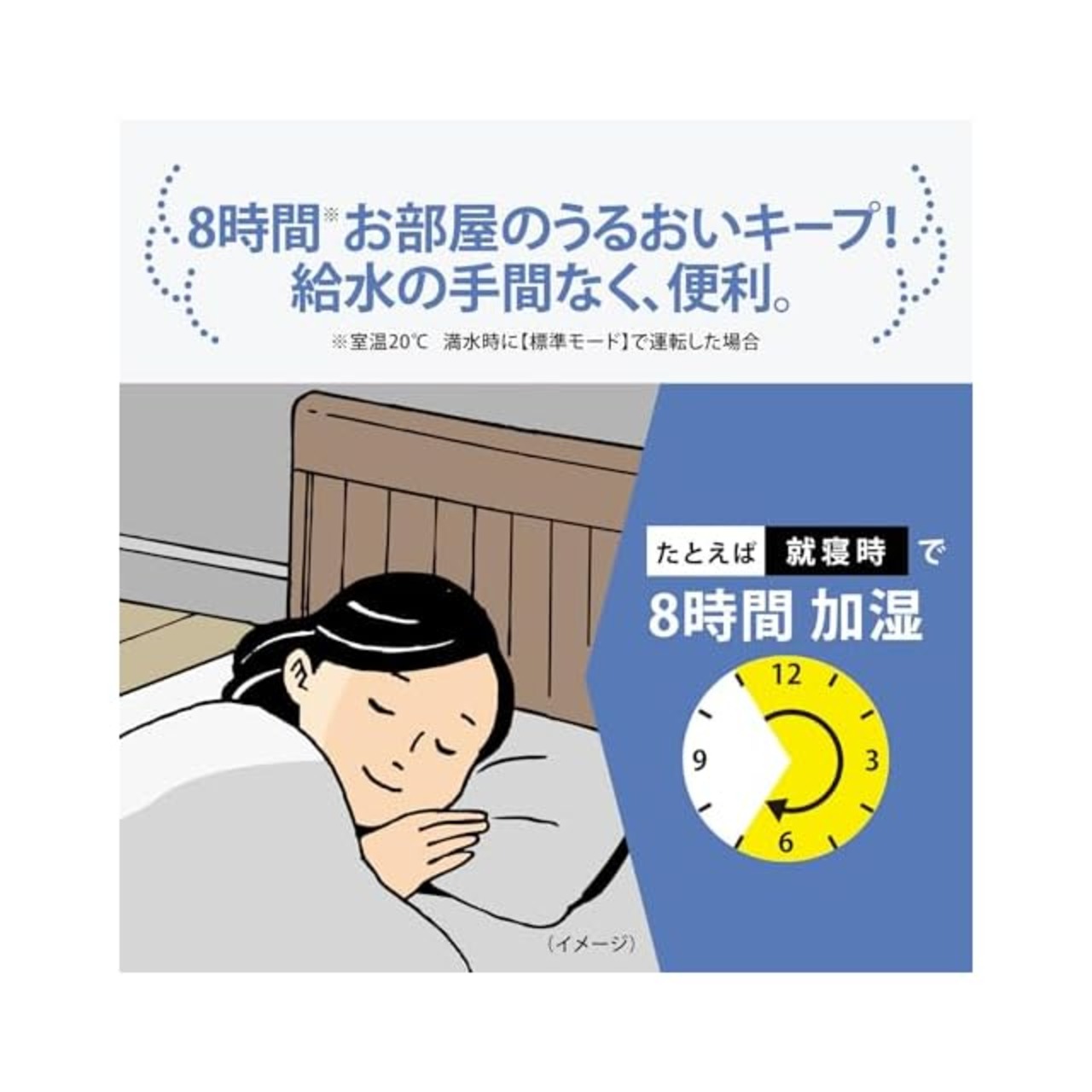 就寝時に便利な長時間加湿「連続加湿約8時間」 ※室温20°C、満水時に標準モードで運転した場合