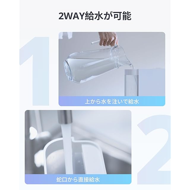 【大容量タンク&2WAY給水】水タンクは4.5Lの大容量で、一回の給水で1日中運転可能です。1日8時間使用する場合、給水は3日に一度でOK。透明な設計で蓋を開けて水の残量を確認する必要もありません。水の残量が20%を切ると、アプリからアラート通知が届きます。水の追加はタンクの蓋を開けて上から水を注ぐだけ。タンクを取り外して給水することも可能です。どなたでも手間なく楽々給水できます。