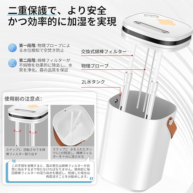 【二重保護設計&安全性とクリーンなミストを両&】この超音波式加湿器は、物理プローブ搭載で、水切れ時の空焚きを自動防止。さらに綿棒フィルターが水中の微細な不純物をキャッチし、クリーンで均一なミストを安定的に噴出。ご注意:素早くミストを発生させるため、ご使用前に綿棒を水に完全に浸してください。(使用前に毎回綿棒フィルターの湿り具合を確認し、乾燥した場合は再度浸すことをお勧めします)。