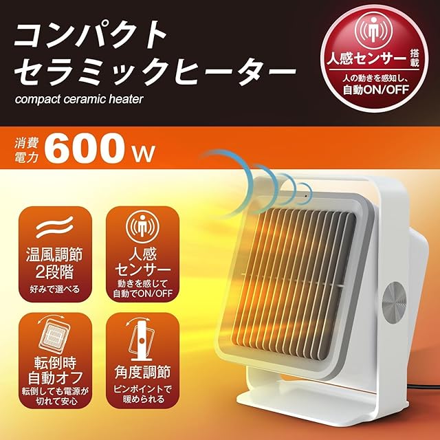 <b> 小さいけれどハイパワー!</b> <br> <b>安心の人感ミニヒーター。</b> <br> 人感センサー付 小型セラミックファンヒーターは、スイッチを入れるとすぐに暖かい風が出てくる小型暖房器具。<br> 一人で使うのにピッタリなコンパクトサイズは、キッチン・トイレ・玄関など置き場所を選びません。<br> 小さなボディですが、600Wのハイパワーを実現。寒さで冷えた体を足元からゆっくり温めてくれます。<br> <br> <b> 人感センサー付 ミニセラミックファンヒーターの特徴</b> <br> 【1】人感センサー付きで無駄な電力をカット!<br> 【2】スイッチONですぐに暖まる<br> 【3】コンパクトで置き場を選ばない<br> 【4】小さいのにハイパワー600w<br> 【5】ピンポイントで暖められる角度調節機能付き。<br> 【6】転倒時自動OFF、過熱保護機能付き<br> 【7】シンプルで操作はとっても簡単<br> 背面フィルターを採用しているので、清潔しながら狭い空間を暖めることもできます。<br> また、転倒時運転停止センサーや過熱保護機能など、安全面も考慮された小型電気ファンヒーターです!<br> シンプルなデザインで、操作も簡単!あの人に、家族に、あなたに。お得にちょっといい冬のギフトを。<br>