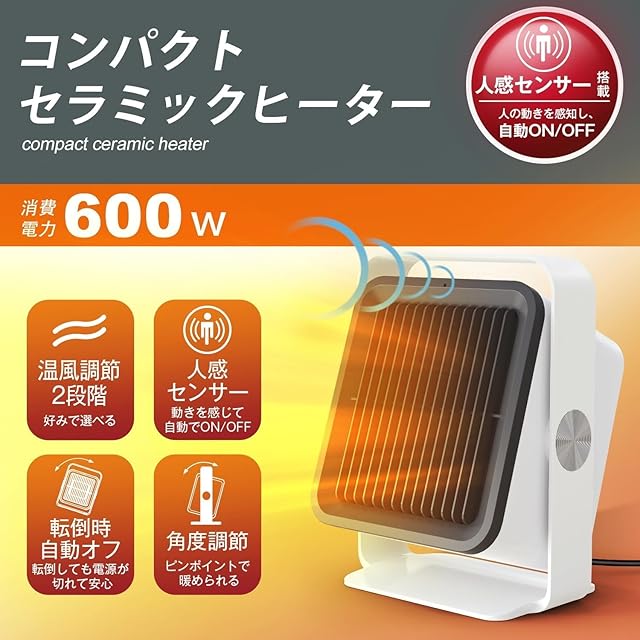<b> 小さいけれどハイパワー!</b> <br> <b>安心の人感ミニヒーター。</b> <br> 人感センサー付 セラミックファンヒーターは、スイッチを入れるとすぐに暖かい風が出てくる小型暖房器具。<br> 一人で使うのにピッタリなコンパクトサイズは、キッチン・トイレ・玄関など置き場所を選びません。<br> 小さなボディですが、600Wのハイパワーを実現。寒さで冷えた体を足元からゆっくり温めてくれます。<br> <br> <b> 人感センサー付 ミニセラミックファンヒーターの特徴</b> <br> 【1】人感センサー付きで無駄な電力をカット!<br> 【2】スイッチONですぐに暖まる<br> 【3】コンパクトで置き場を選ばない<br> 【4】小さいのにハイパワー600w<br> 【5】ピンポイントで暖められる角度調節機能付き。<br> 【6】転倒時自動OFF、過熱保護機能付き<br> 【7】シンプルで操作はとっても簡単<br> 背面フィルターを採用しているので、清潔しながら狭い空間を暖めることもできます。<br> また、転倒時運転停止センサーや過熱保護機能など、安全面も考慮された小型ファンヒーターです!<br> シンプルなデザインで、操作も簡単!あの人に、家族に、あなたに。お得にちょっといい冬のギフトを。<br>