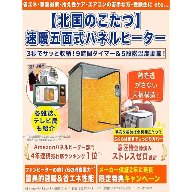 《新品未開封》パネルヒーター デスク下 足元ヒーター【北国のこたつ ・2年品質】 フットウォーマー 省エネ 10秒速暖 5段階温度調節 9段階切タイマー 転倒オフ 寒さ対策 底面発熱 天板付き 日本仕様 暖房器具 受験勉強 オフィスに最適 足温器 (ゆったり5面式)