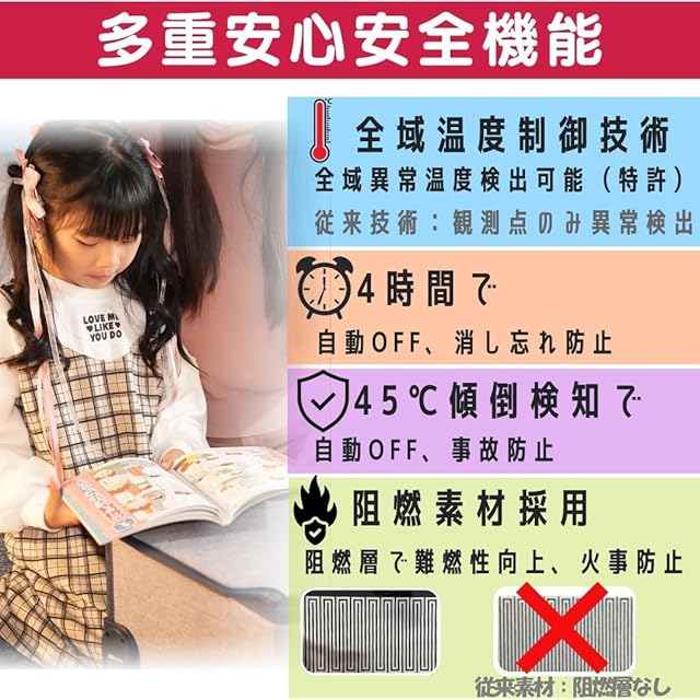 【安心・安全設計のパネルヒーターで、家族みんなが安心!】PSE、RoHS認証取得済みで、温度制御回路による過熱防止機能も搭載しています。4時間自動OFF機能、45°転倒OFF機能で、小さなお子さんやペットがいるご家庭でも安心安全にご使用いただけるパネルヒーターです。難燃性素材を使用しているので、火災や床の焦げ付きの心配もありません。ヒーター選びは安心・安全が第一です!