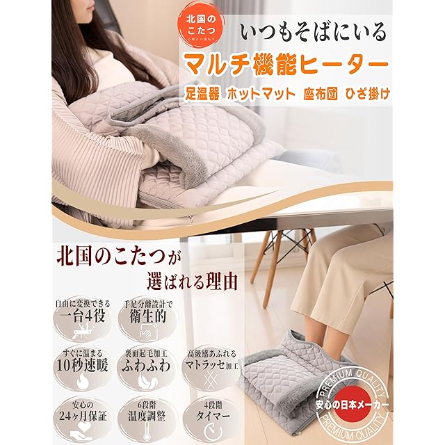 【意匠権申請済み・独自手足セパレートデザイン・高級ブランド鞄に使われるマトラッセ工法】 他社のフットウォーマーやホットマットとは一線を画す、意匠権申請済みのオリジナルデザイン。高級バッグに採用されるマトラッセ工法を取り入れ、見た目にも上質感を演出。さらに手用スペースと足用スペースを分離した構造で、足元ヒーター/電気かいろとしても衛生的に使用可能。