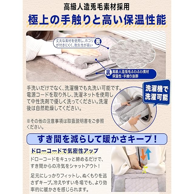 【高保温・汚れにくい耐久素材・人工兔毛・汚れ防止】 使用者の身になって設計し、一般的なホットマットや足元ヒーターよりも厚みを持たせた高保温素材を採用。表面は防塵・耐摩耗生地で、床置き使用でも汚れや擦れに強く、手入れも簡単。さらに手を入れる縁や裏側にはふわふわの人工兔毛を使い、電気カイロや足温器として心地よい触感を実現。コードを外せば洗濯機で丸洗いOK。
